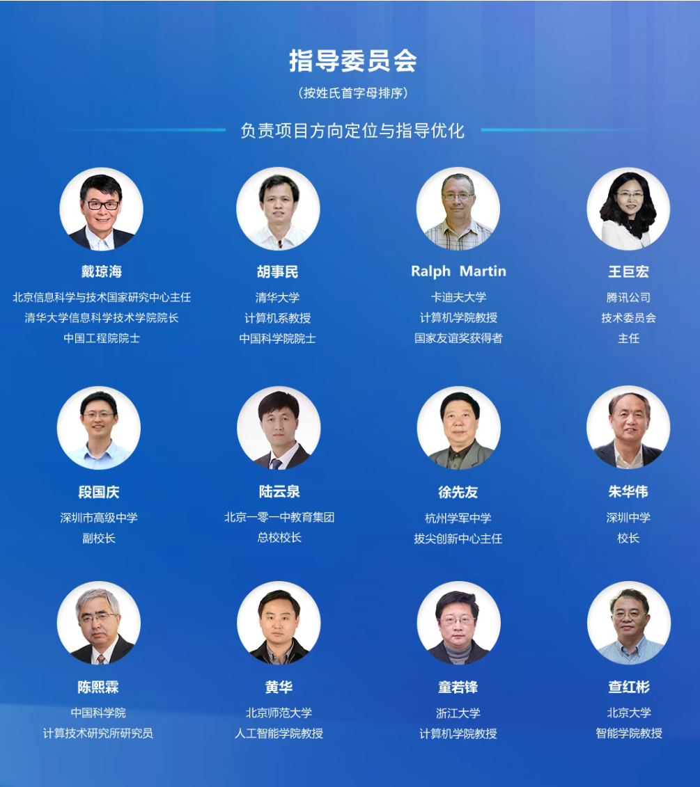 本计划由中国工程院院士、清华大学戴琼海教授,中国科学院院士、清华大学胡事民教授,腾讯公司技术委员会主任王巨宏女士,国家友谊奖获得者、英国卡迪夫大学计算机学院Ralph Martin教授等教育界、产业界知名专家担任指导委员会委员,为各项工作提供指导。
