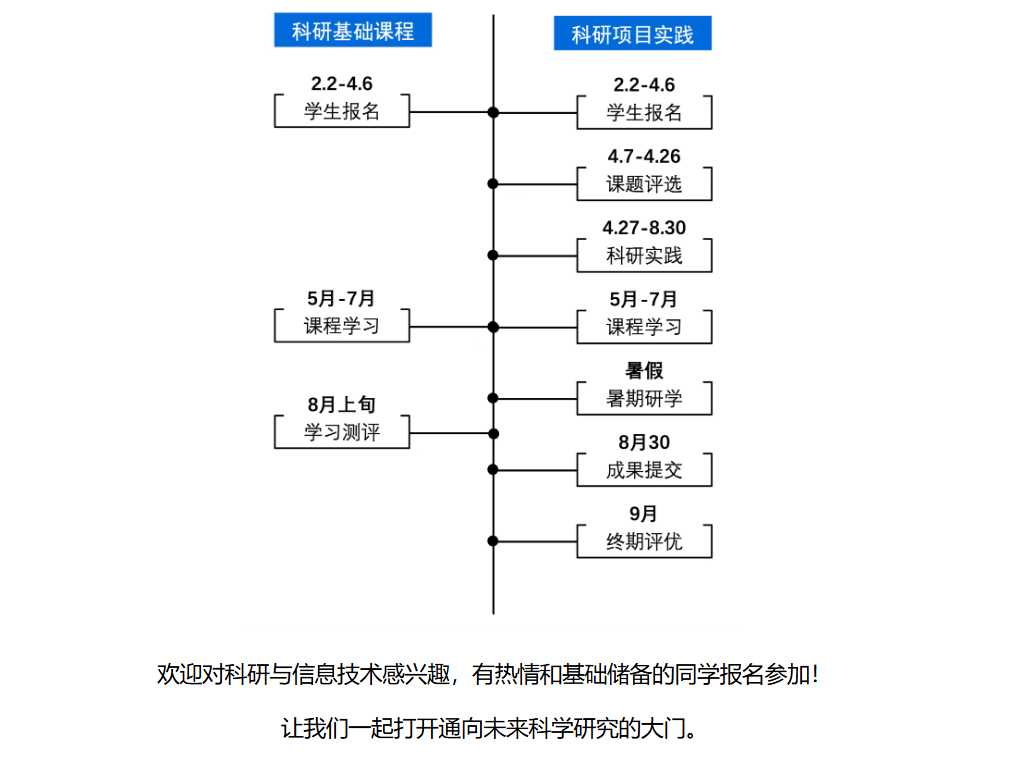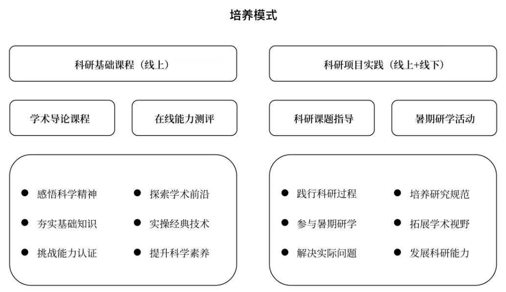 本计划由“科研基础课程”与“科研项目实践”两部分组成双轨制的培养模式。科研基础课程侧重信息技术领域科研基础概念与知识的普及;科研项目实践侧重同学们在高校与中学导师指导下开展具体的科学研究工作,提升科学研究的基础能力。两个部分相互独立,互有联系。学生可根据实际需求单独或同时报名参与。