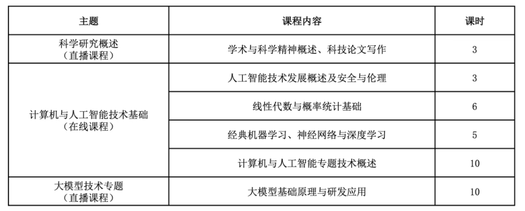 “科研基础课程”包括直播课程和视频课程,学生可线上学习科学研究综述、计算机与人工智能基础课程、数学与算法基础知识及大模型技术专题课程。完成科研基础课程后,学生可参与在线测评,检验学习效果。参考如下: