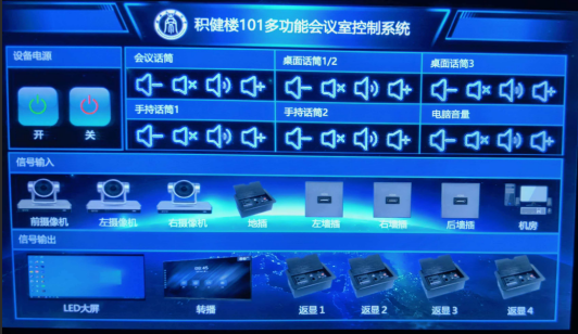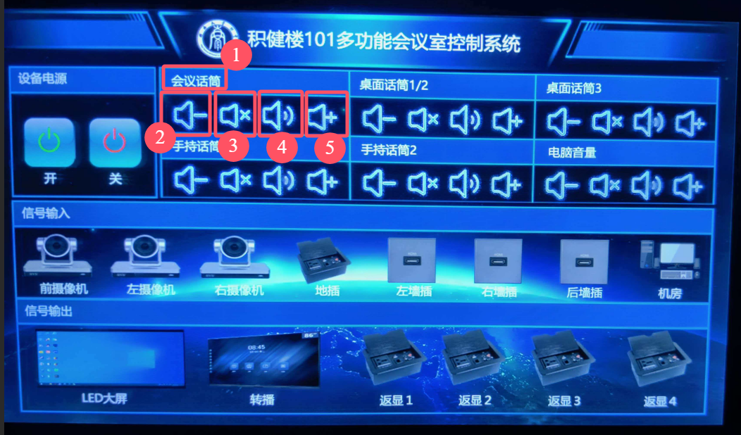关闭话筒、笔记本电脑电源,最后点击墙上控制平板设备电源【关】按键,关闭电源即可。