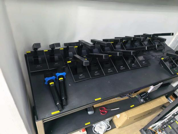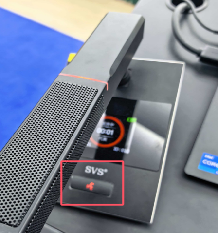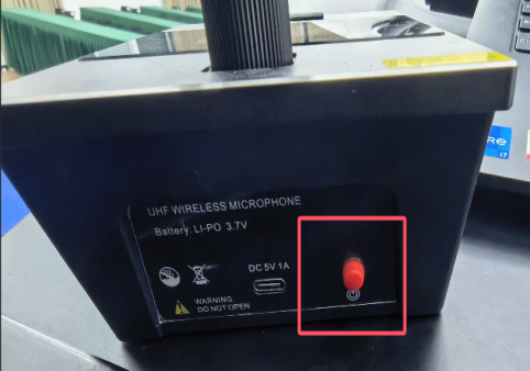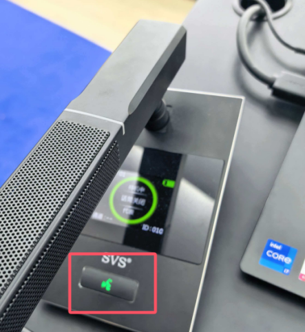 长按坐式话筒背后红色开关按钮开机,话筒亮灯即可使用(话筒前面板按键切换静音与发言,绿色为静音,红色为可正常发言)。