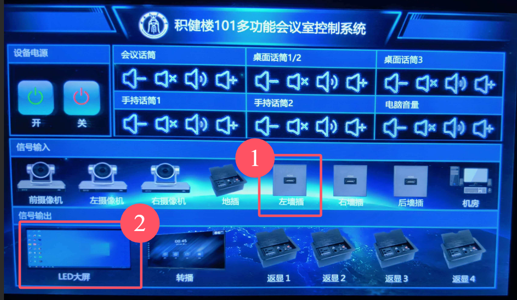 a) 切换主席台电脑(打开默认为主席台电脑),依次点击墙上控制平板【左墙插】-【LED大屏】,切换为主席台笔记本显示。