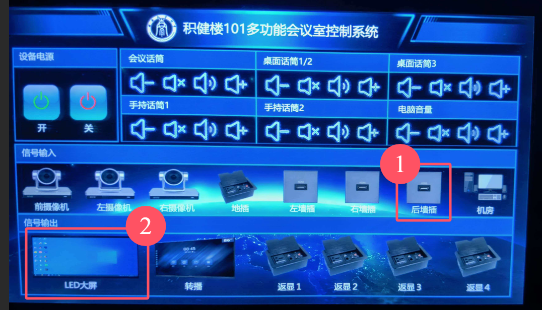 b) 切换会议室后方信号输入笔记本,依次点击墙上控制平板【后墙插】-【LED大屏】,切换为后台台笔记本显示。