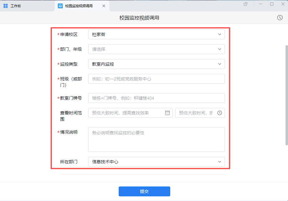 3.2 填写申请信息(请详细填写教室编号、时段、调用理由)