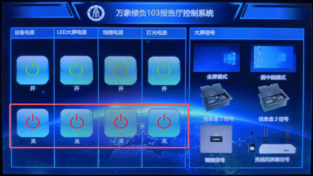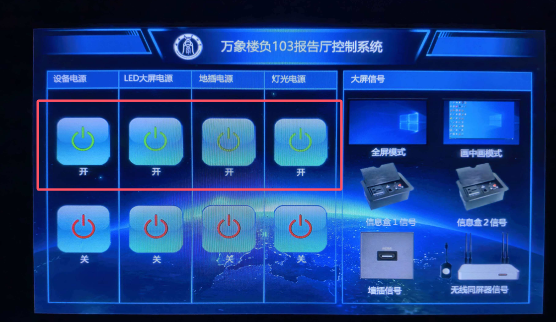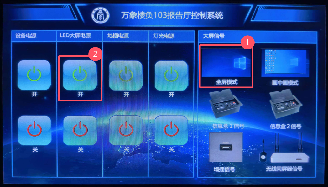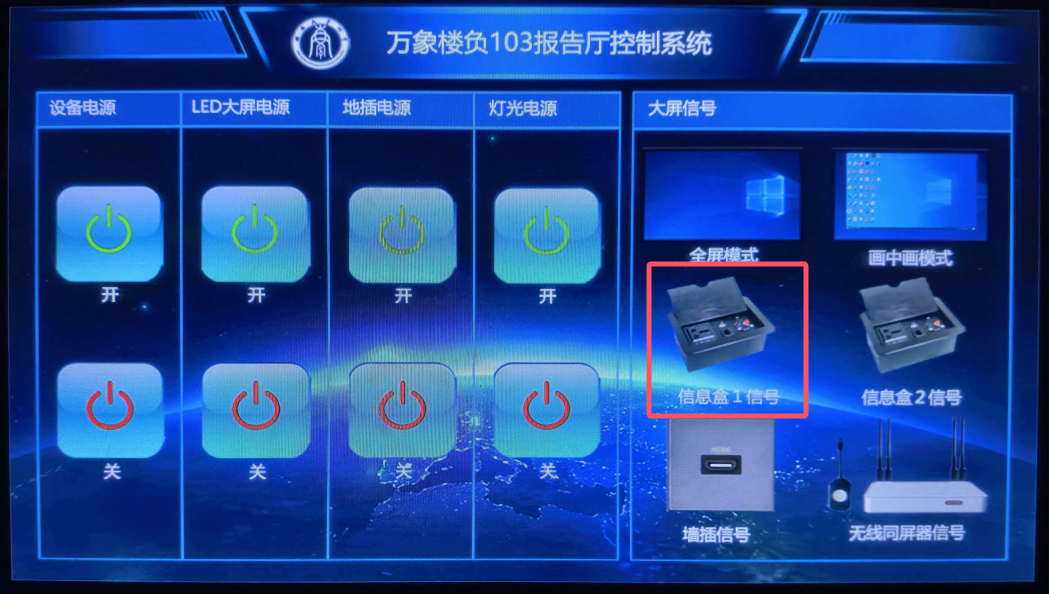 b. LED屏幕正常启动,点击【信号盒1信号】,即可切换为笔记本电脑投屏;若单次点击无反应,可尝试点击【信号盒2信号】,再点击【信号盒1信号】。