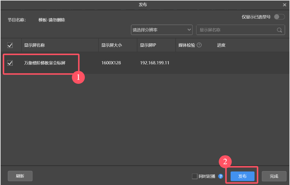 6. 勾选将要发布文字的显示屏(此处默认只有一块),最后点击发布,等软件上传成功之后LED会标即修改成功。