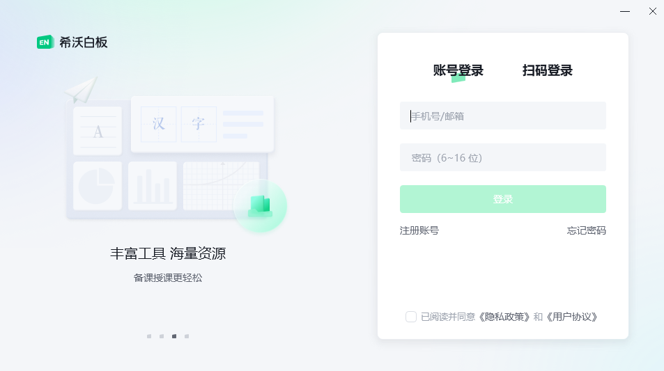 双击打开 希沃白板软件 ,默认已为大家创建账号,可直接输入账号密码进行登陆 ,无账号的用户需要进行免费的账号注册或微信扫一扫进行登陆 ,具体操作流程如下图。(如有疑问可联系信息中心)