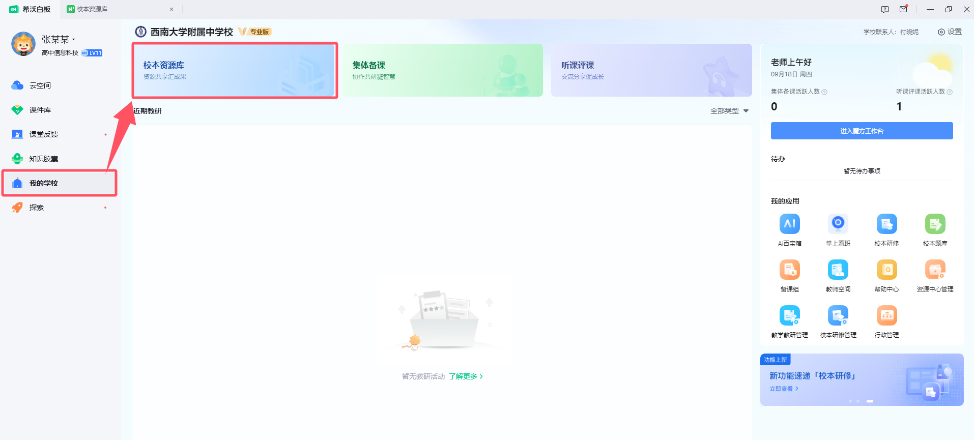登录进入白板的个人云空间后 ,在左侧可以找到我的学校选项,选择校本资源库。即可进入