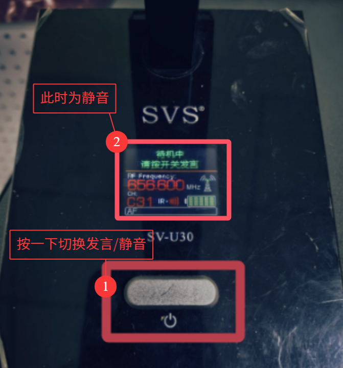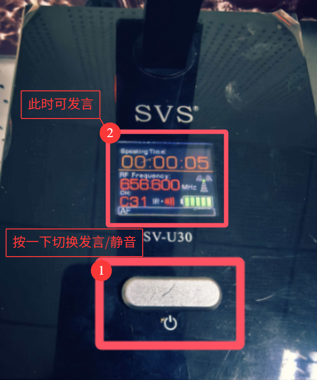 长按坐式话筒按钮开机,话筒亮灯即可使用(开机后,话筒前面板按键切换静音与发言,绿色为静音,红色为可正常发言)。