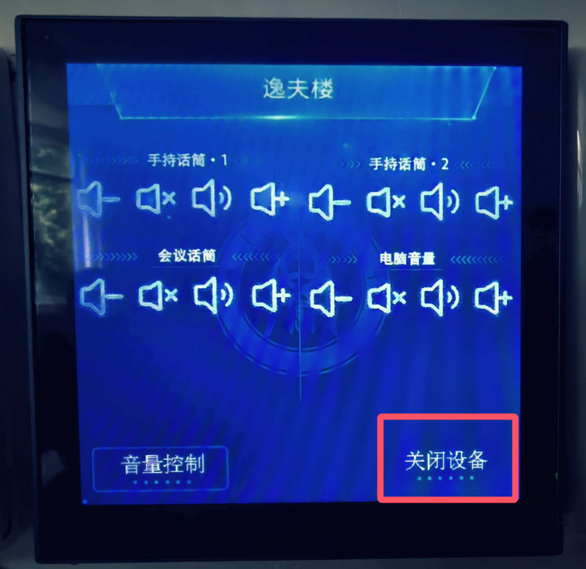关闭话筒、笔记本电脑电源,最后点击墙上控制平板【关闭设备】按键,关闭电源即可。